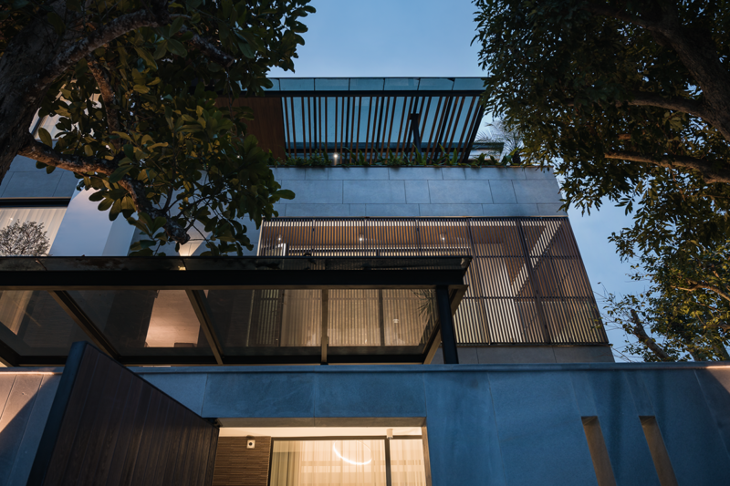 Gia chủ trong độ tuổi U40 nhưng có gu thẩm mỹ rõ ràng và hiện đại, luôn tôn trọng thiết kế từ tông màu, ngôn ngữ đến vật liệu hoàn thiện. Điều này tạo điều kiện cho kiến trúc sư có nhiều không gian để sáng tạo. Điểm nhấn nổi bật của diện mạo Villa Vinh Tân khi nhìn từ bên ngoài là hệ lam gỗ nhựa mặt tiền di động với tông nâu trầm, không chỉ mang tính thẩm mỹ mà còn hiệu quả trong việc chắn ánh nắng gay gắt hướng Tây.