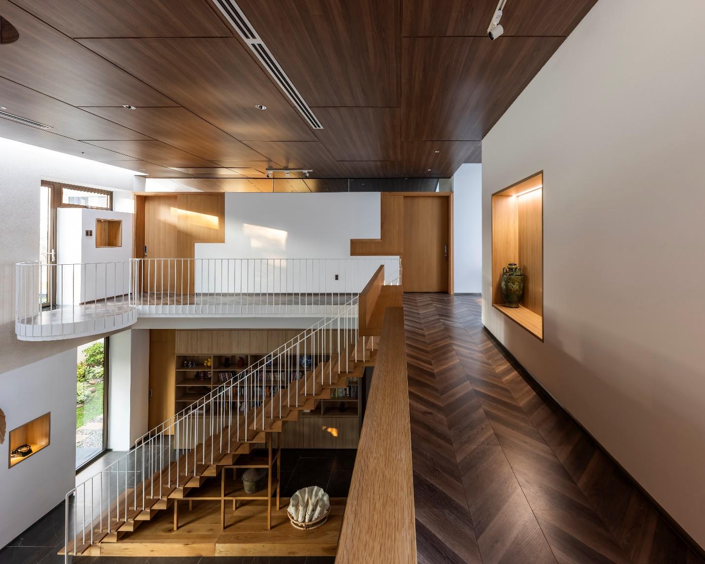 Các phòng ngủ ở tầng hai được thiết kế hiện đại men theo hai trục hành lang bao quanh ô thông tầng, nhóm thiết kế một không gian mở với các góc nhìn đa dạng ra cảnh quan bên ngoài. Các bức tường ngăn chia không chạm trần, kết hợp cùng các hình dáng cửa đi, cửa sổ và các yếu tố trang trí như những đường cong và chéo của trần, tạo nên một không gian sống động và đầy cảm hứng. Không gian riêng tư trong mỗi phòng ngủ không hề tách biệt khỏi thiên nhiên, mà luôn tạo ra những điểm nhìn thư giãn, thiết kế hiện đại