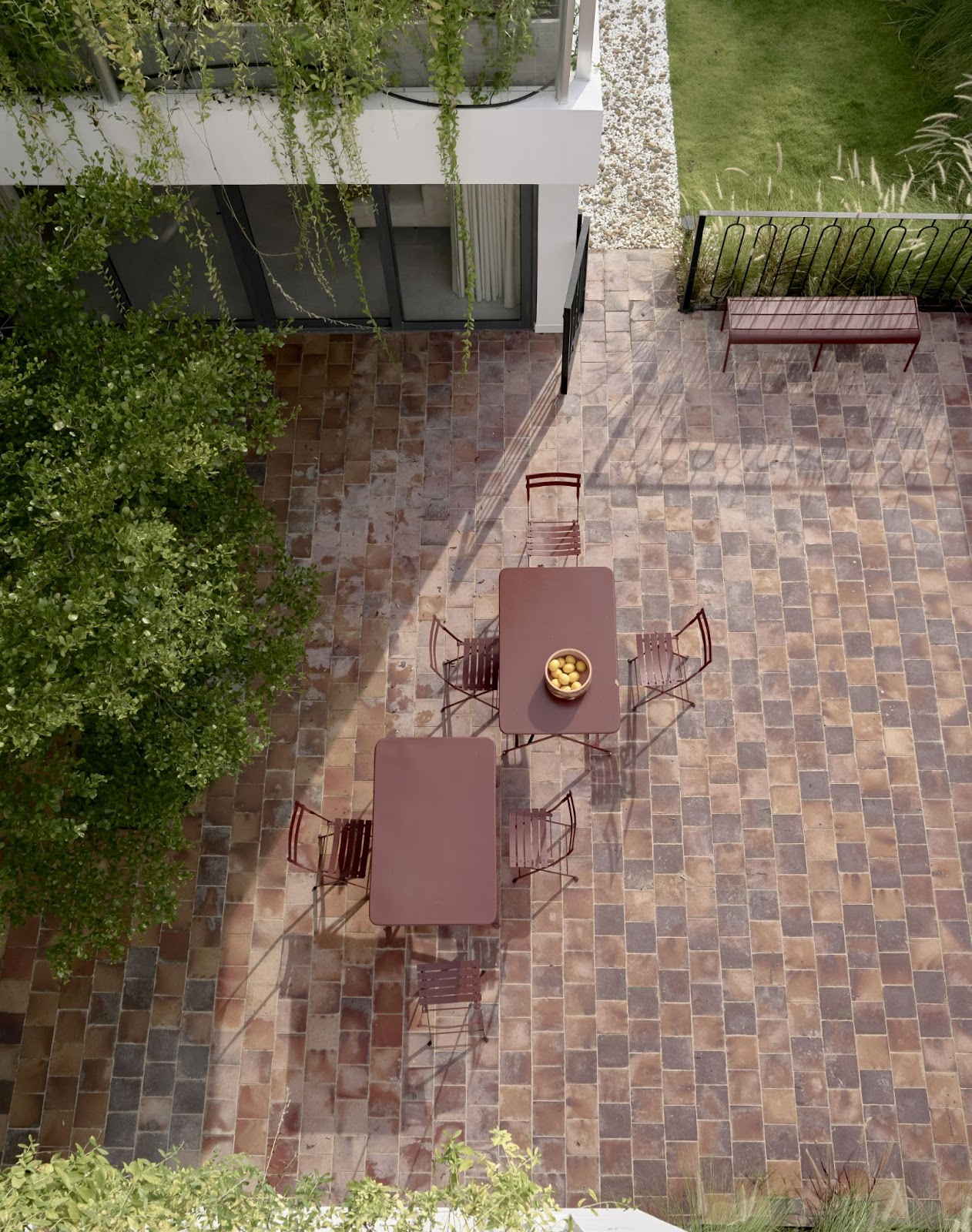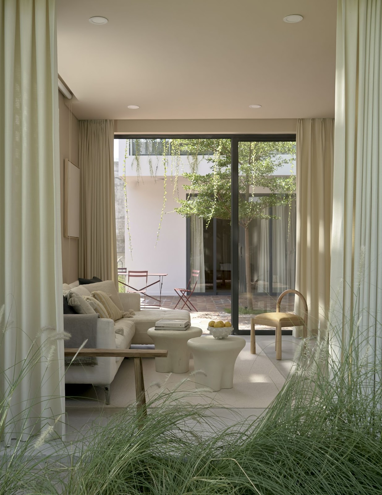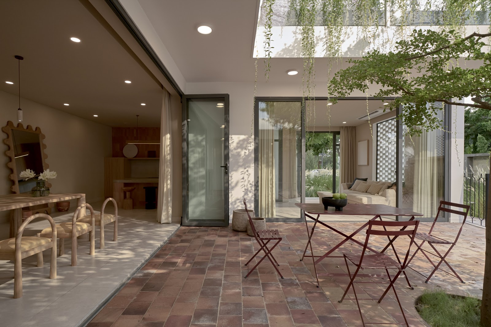 Đặc điểm nổi bật của Terra Villa là sự tích hợp liền mạch giữa không gian nội thất và ngoại thất. Việc duy trì độ cao sàn đồng nhất và bố trí cây xanh bao quanh khu vực sân trong, kết nối với các khu vực sinh hoạt chung, thể hiện rõ ràng ý định của kiến trúc sư trong việc nâng cao chất lượng cuộc sống cho gia chủ. Điều này thúc đẩy một lối sống kết hợp hài hòa giữa hoạt động ngoài trời và sinh hoạt trong nhà. Hơn nữa, việc sử dụng vật liệu tự nhiên cho từng món nội thất được thiết kế riêng tại Terra Villa, cùng với gạch lát từ đất nung địa phương, không chỉ mang lại sự ấm áp mà còn phản ánh chân thực niềm đam mê quay về với nguyên liệu tự nhiên của cả gia chủ lẫn nhà thiết kế dự án.