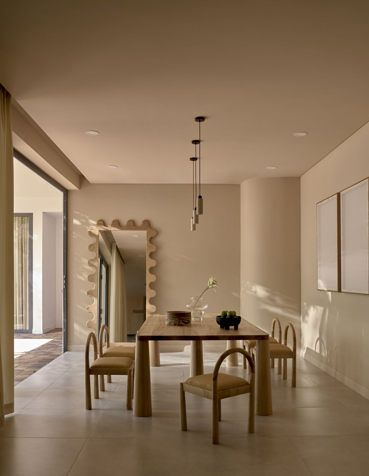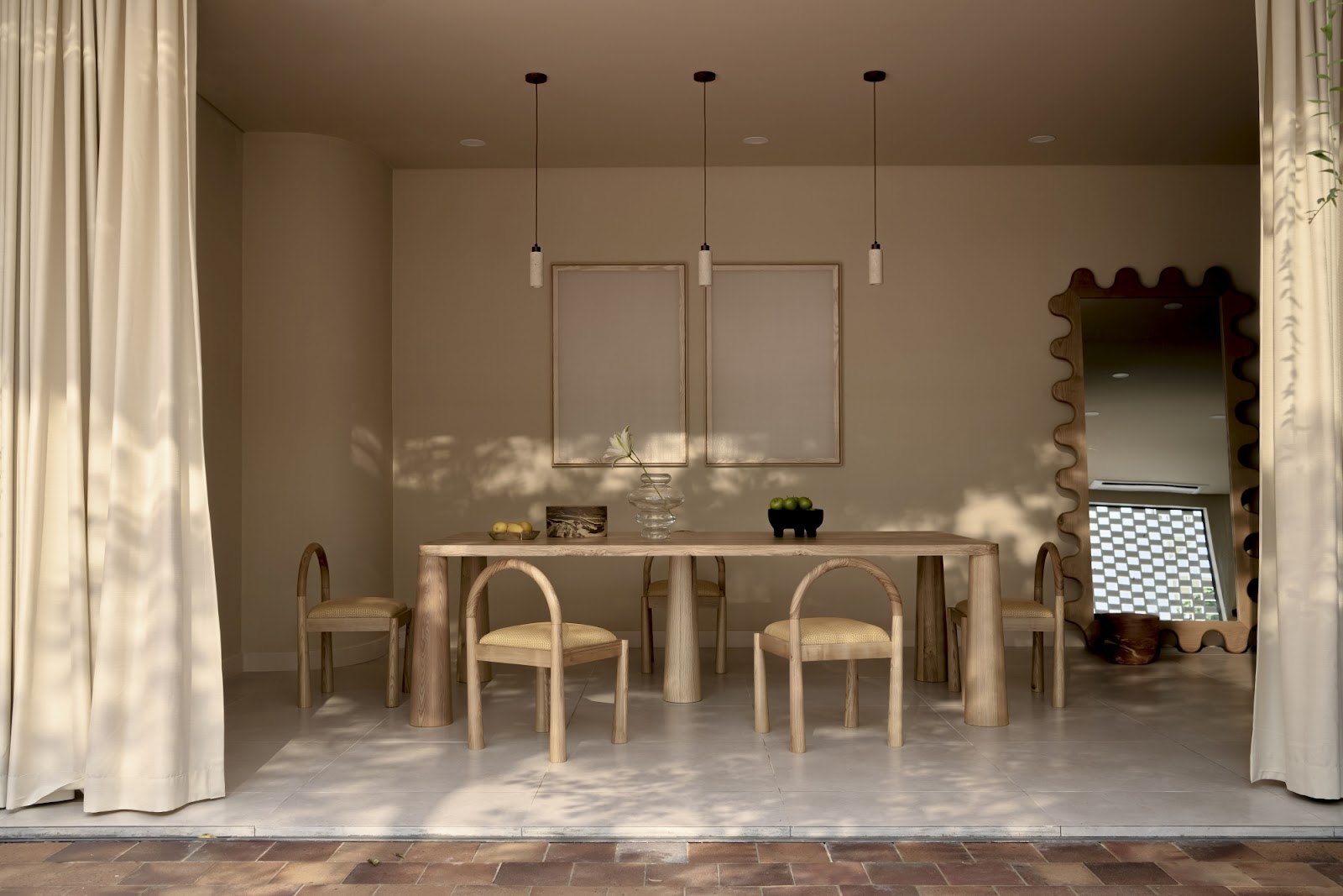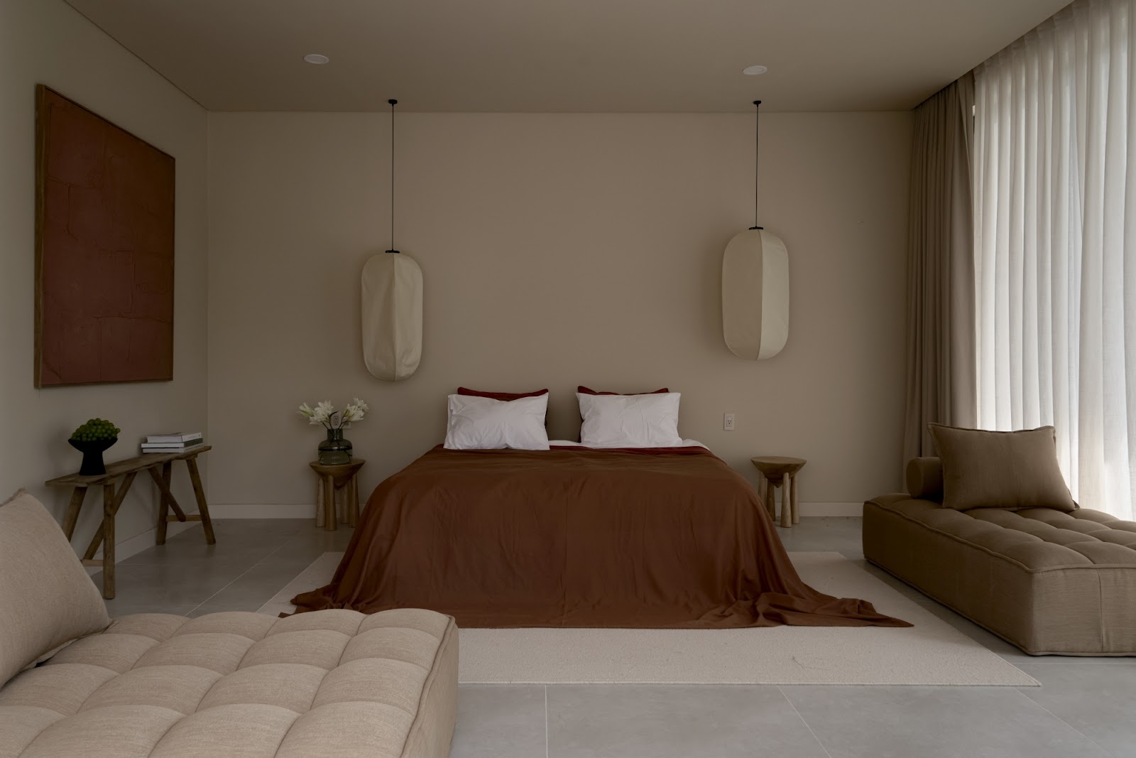 Đặc điểm nổi bật của Terra Villa là sự tích hợp liền mạch giữa không gian nội thất và ngoại thất. Việc duy trì độ cao sàn đồng nhất và bố trí cây xanh bao quanh khu vực sân trong, kết nối với các khu vực sinh hoạt chung, thể hiện rõ ràng ý định của kiến trúc sư trong việc nâng cao chất lượng cuộc sống cho gia chủ. Điều này thúc đẩy một lối sống kết hợp hài hòa giữa hoạt động ngoài trời và sinh hoạt trong nhà. Hơn nữa, việc sử dụng vật liệu tự nhiên cho từng món nội thất được thiết kế riêng tại Terra Villa, cùng với gạch lát từ đất nung địa phương, không chỉ mang lại sự ấm áp mà còn phản ánh chân thực niềm đam mê quay về với nguyên liệu tự nhiên của cả gia chủ lẫn nhà thiết kế dự án.