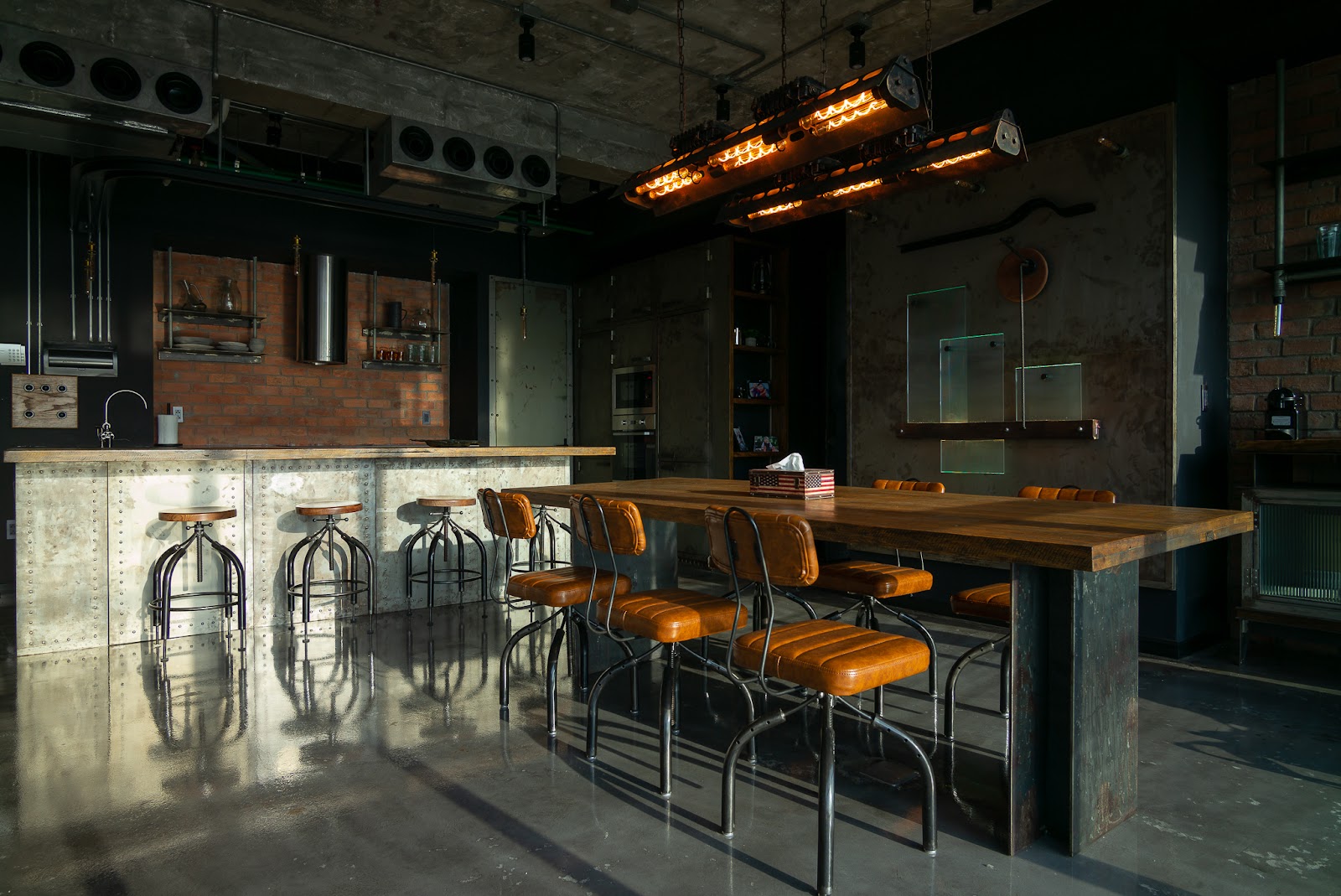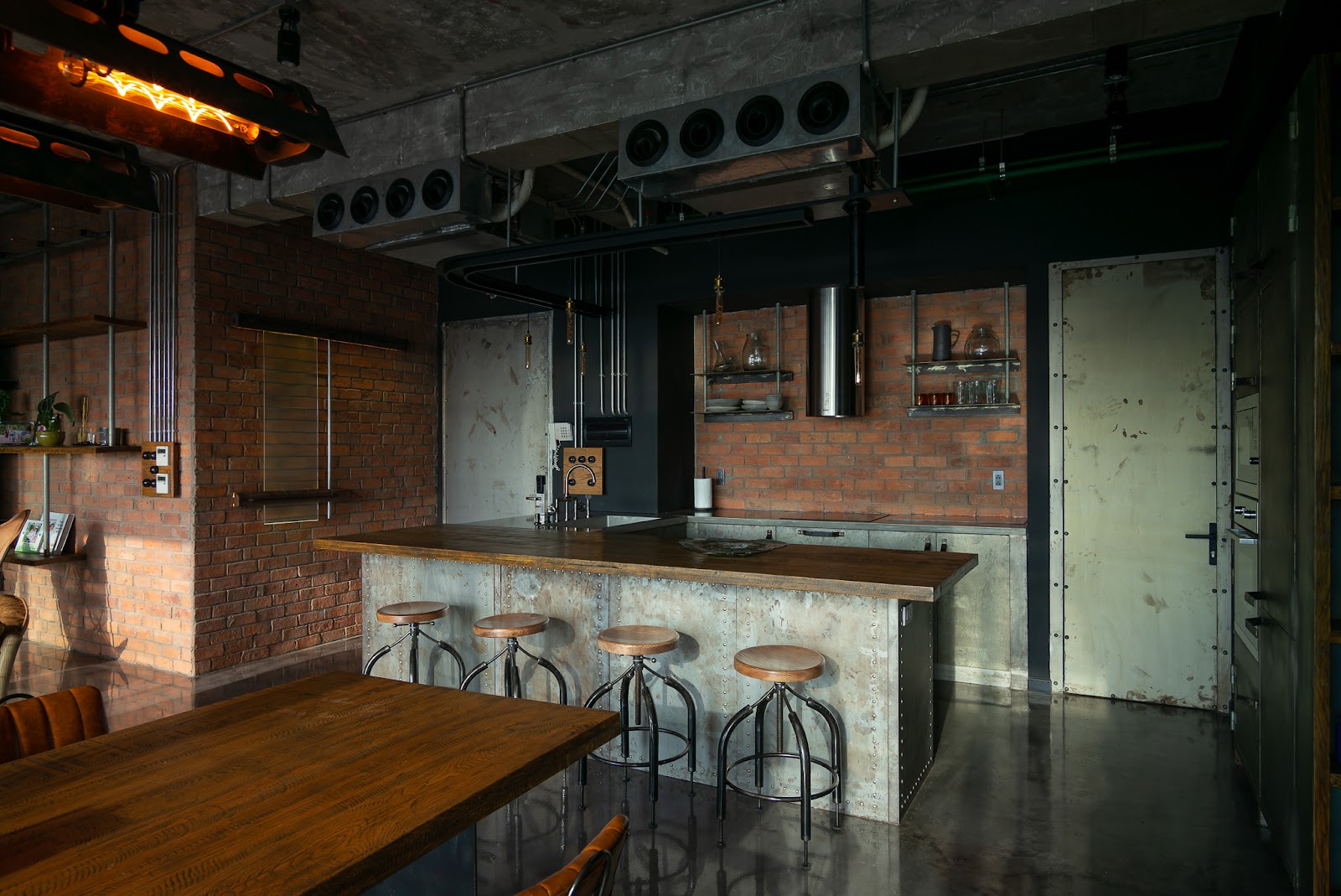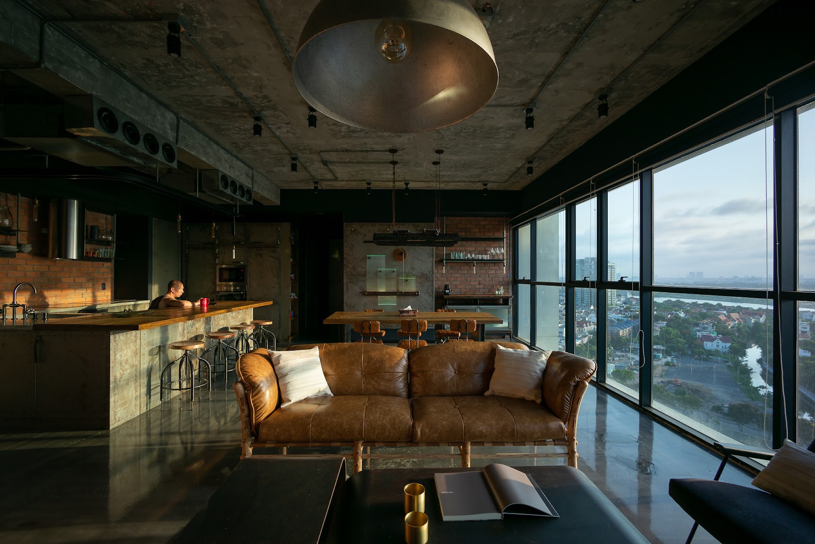 Căn hộ được xử lý như một xưởng thủ công thực thụ: gạch trần giữ nguyên vẻ mộc mạc chưa tô vữa; trần bê tông lộ rõ dấu vết ván khuôn; sàn bê tông mài lưu giữ cả những đường xước nhỏ bé qua thời gian. Hệ thống điện nổi bằng ống thép cùng nội thất gỗ nguyên khối, kim loại gỉ sét và da thật góp phần xây dựng bảng chất liệu đậm nét xưởng thủ công – nơi sự giản dị được đề cao nhằm truyền tải chiều sâu cũng như giá trị kể chuyện của từng món đồ. Đặc biệt hơn cả chính ở việc các chất liệu này luôn hiện diện đúng với bản chất vốn có: trung thực tuyệt đối thay vì tô điểm hay chạy theo thị hiếu nhất thời.