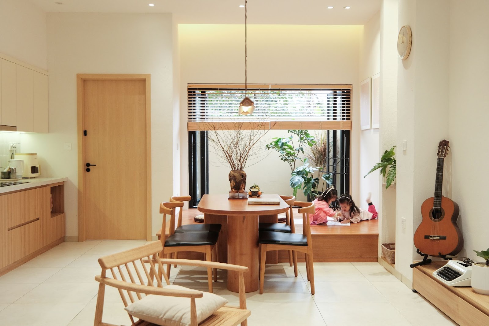 Tầng trệt là không gian mở, kết nối linh hoạt các chức năng sinh hoạt chung như phòng khách, bếp ăn và sân vườn. Gỗ được lựa chọn làm vật liệu chủ đạo nhằm mang lại cảm giác ấm áp nhưng vẫn giữ nét tinh giản. Các chi tiết nội thất đều được tiết chế tối đa để đảm bảo công năng sử dụng thuận tiện cho sinh hoạt gia đình hàng ngày cũng như dễ dàng bảo trì.