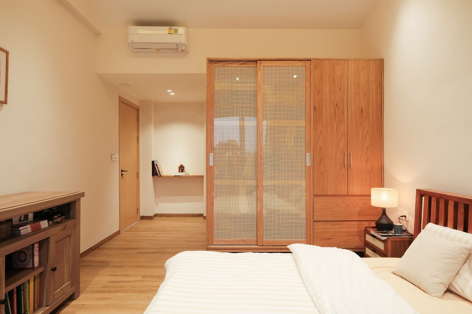 Phòng ngủ chính được bố trí riêng biệt với cửa trượt lớn hướng ra vườn ngoài trời giúp mở rộng tầm nhìn và tăng cường sự hòa nhập với thiên nhiên. Toàn bộ ngôi nhà sử dụng gam màu trung tính; ánh sáng tự nhiên được khai thác triệt để nhằm tiết kiệm năng lượng đồng thời mang lại cảm giác nhẹ nhàng thư thái cho người sử dụng.