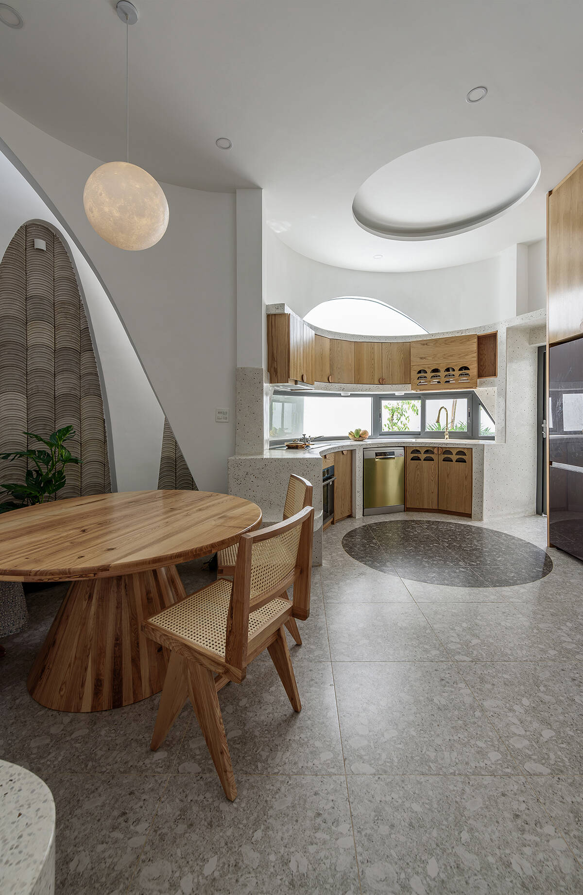 Khu bếp là điểm nhấn thú vị khi bố trí mảng xanh nhỏ ngay cạnh khu vực ăn uống. Dù diện tích hạn chế nhưng cách xử lý ánh sáng, thông gió cùng băng ghế đá hình tròn đã mang lại cảm giác ấm cúng và thoáng đãng hơn cho nơi đây.